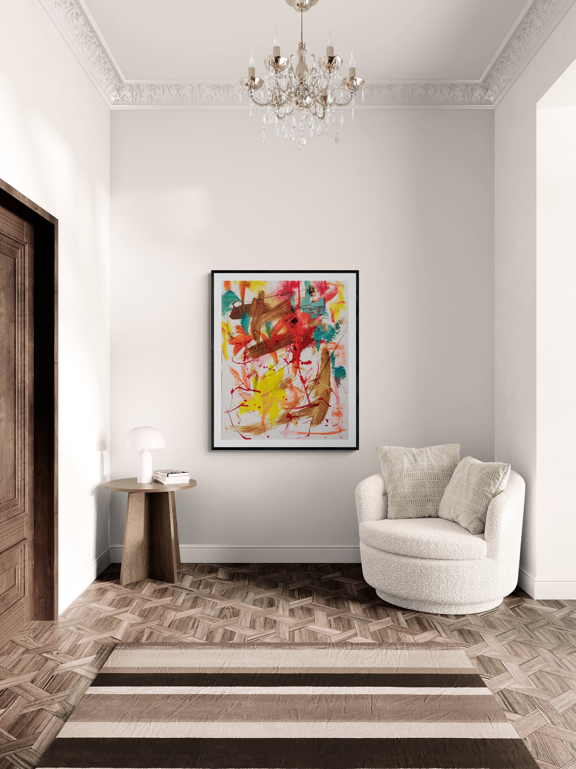 This painting bursts with energy and vividly captures the transformative power of color. The dynamic interplay between yellow and red not only serves as a striking focal point but also harmonizes with the rest of the hues, creating a balanced yet exuberant composition. This piece can serve as a catalyst that enlivens any space, inviting viewers to experience warmth and vibrancy.
